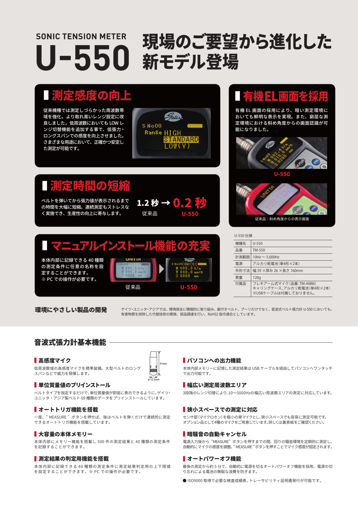 日本製Gates Unitta ME-U550聲波張力計是一款專為工業維護設計的高精度檢測工具,透過先進的聲波感應技術,能快速且非接觸式地測量皮帶張力,避免傳統機械測試方式的不便與誤差。只需感應皮帶振動頻率,即可在數位螢幕上顯示精確數值,操作簡單直覺,即使非專業人員也能快速上手。